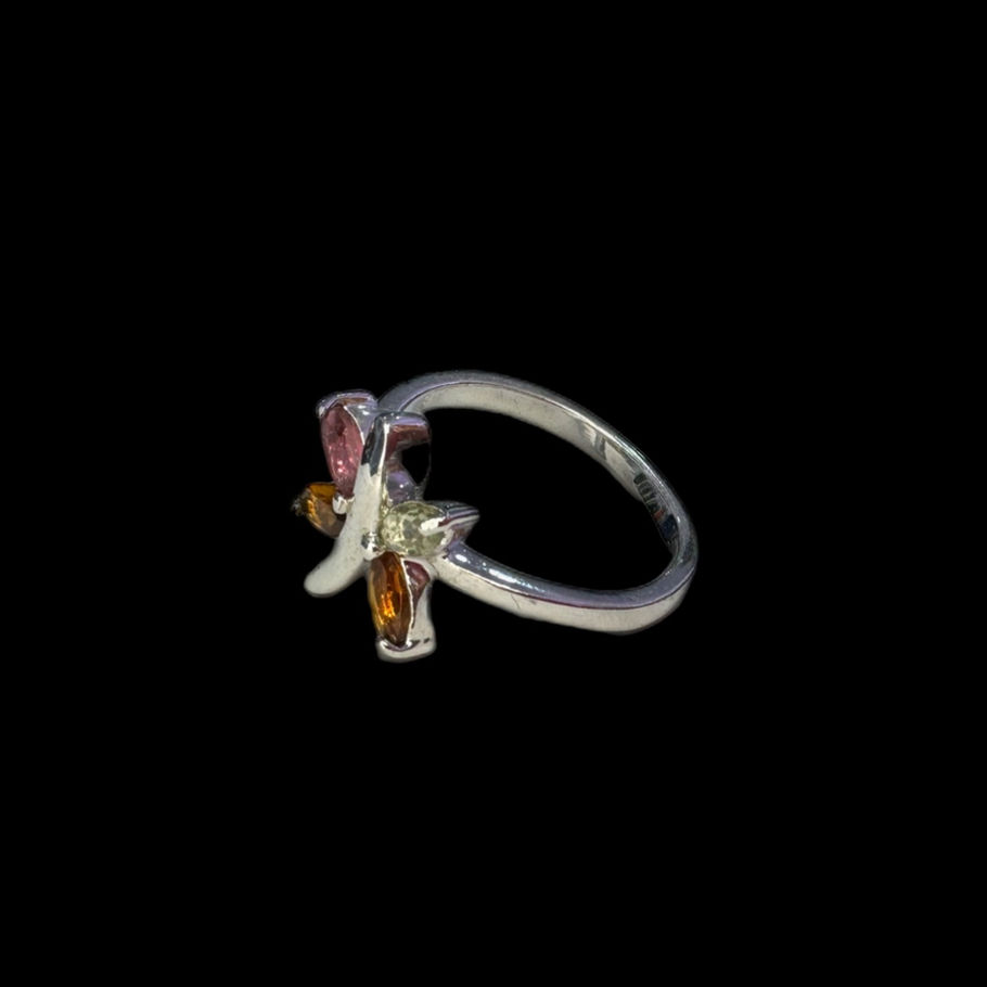 A delicate, sterling silver ring with a frontal butterfly design, the wings composed of colored zirconias.