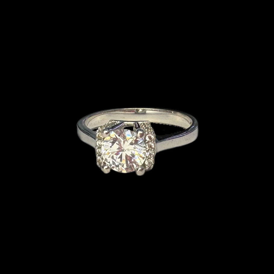 Sterling silver wedding ring with a central 6mm, central, circular zirconia - elevated in a square frame of smaller zirconias.