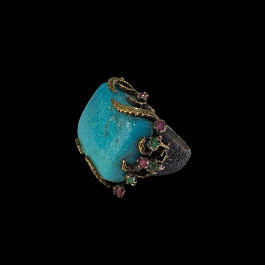 Black-silver ring with an extensive, unique design, set with natural stones.