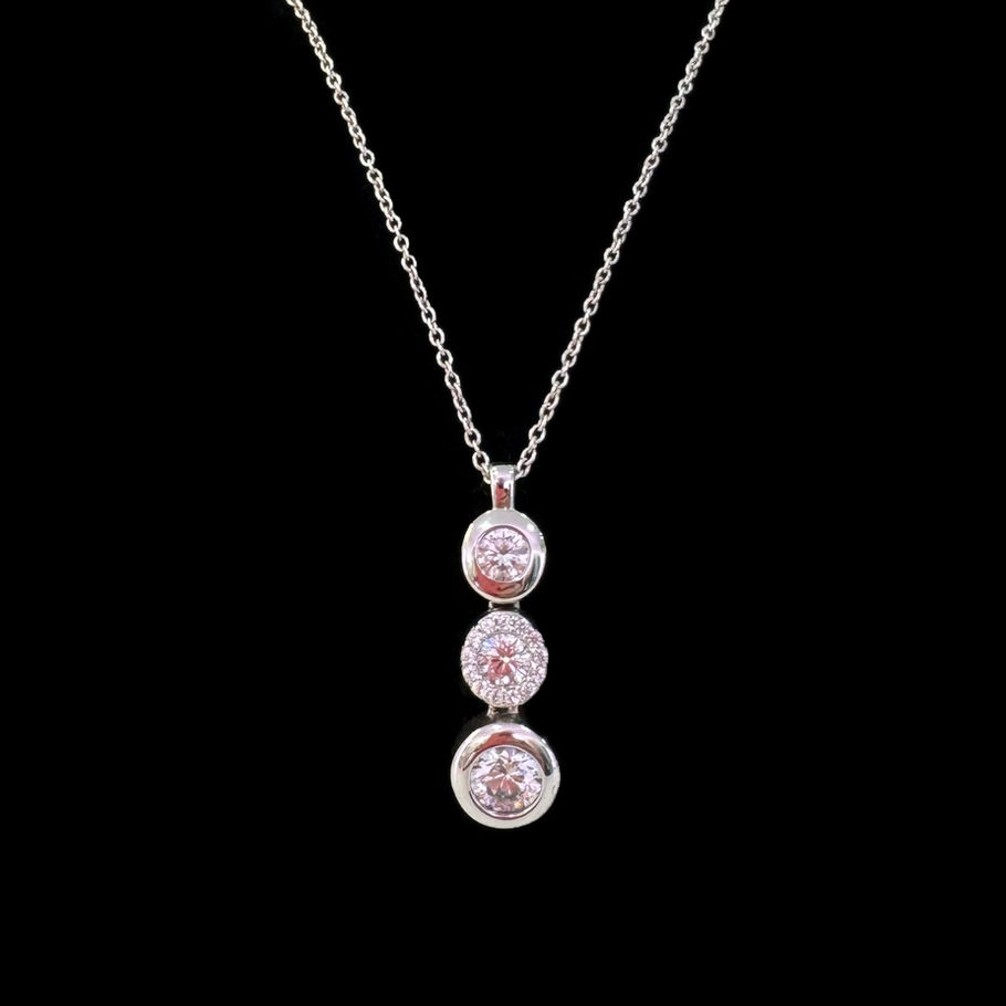 Silver chain with a pendant of 3 vertical zirconia circles, 2 framed in silver and one in smaller zirconia.