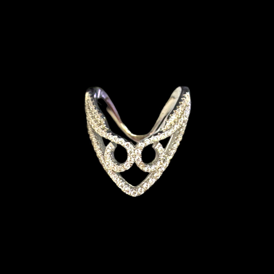 Sterling silver ring with a double bend. Frontal design is set with white zirconia.